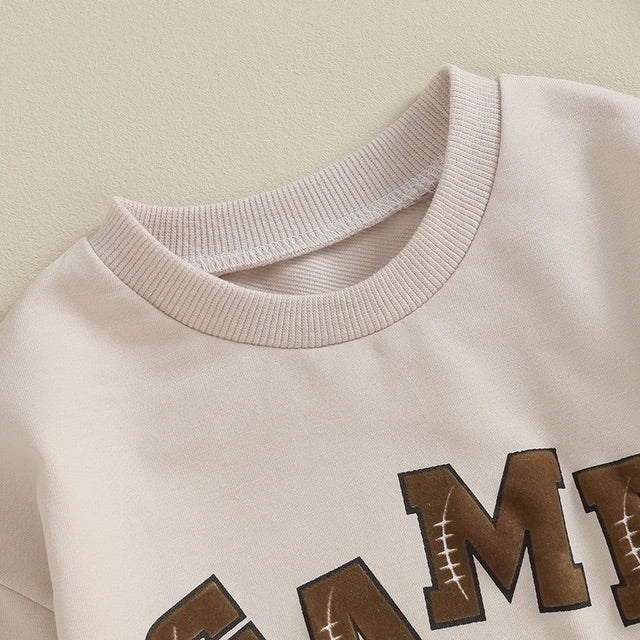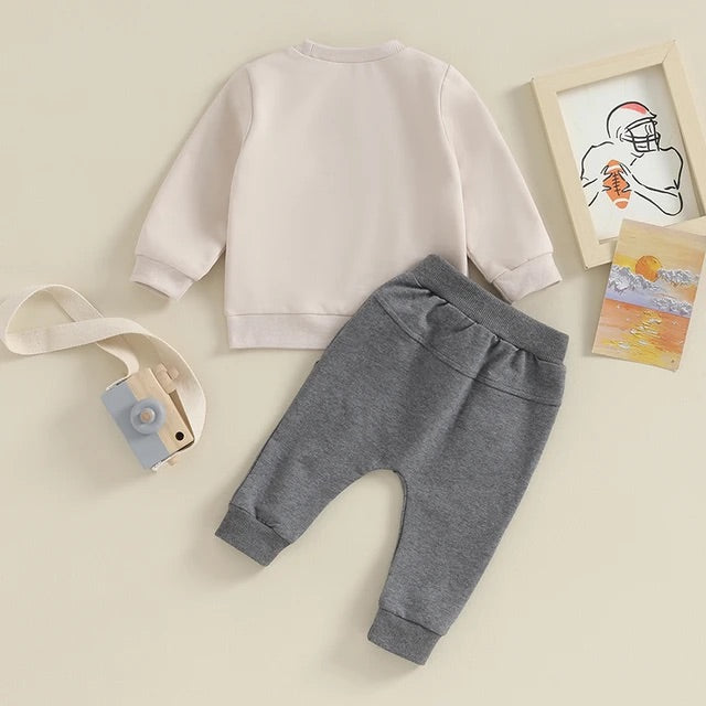 Get your little ones ready for game day with this stylish Kids' Football Sweatshirt. Made with comfort in mind, this sweatshirt is perfect for cheering on their favorite team. The 2-piece set includes a cozy sweatshirt with a football design, and matching sweatpants. Crafted with soft and breathable fabric, this sweatshirt set will keep your child comfortable as they show their support. Whether they're watching the game or joining in on the fun, this Game Day Sweatshirt is a must-have for young football fans.