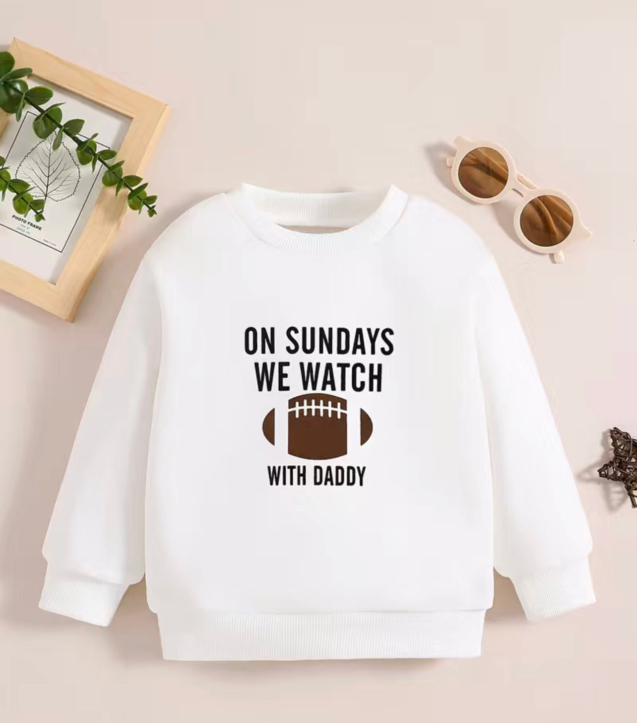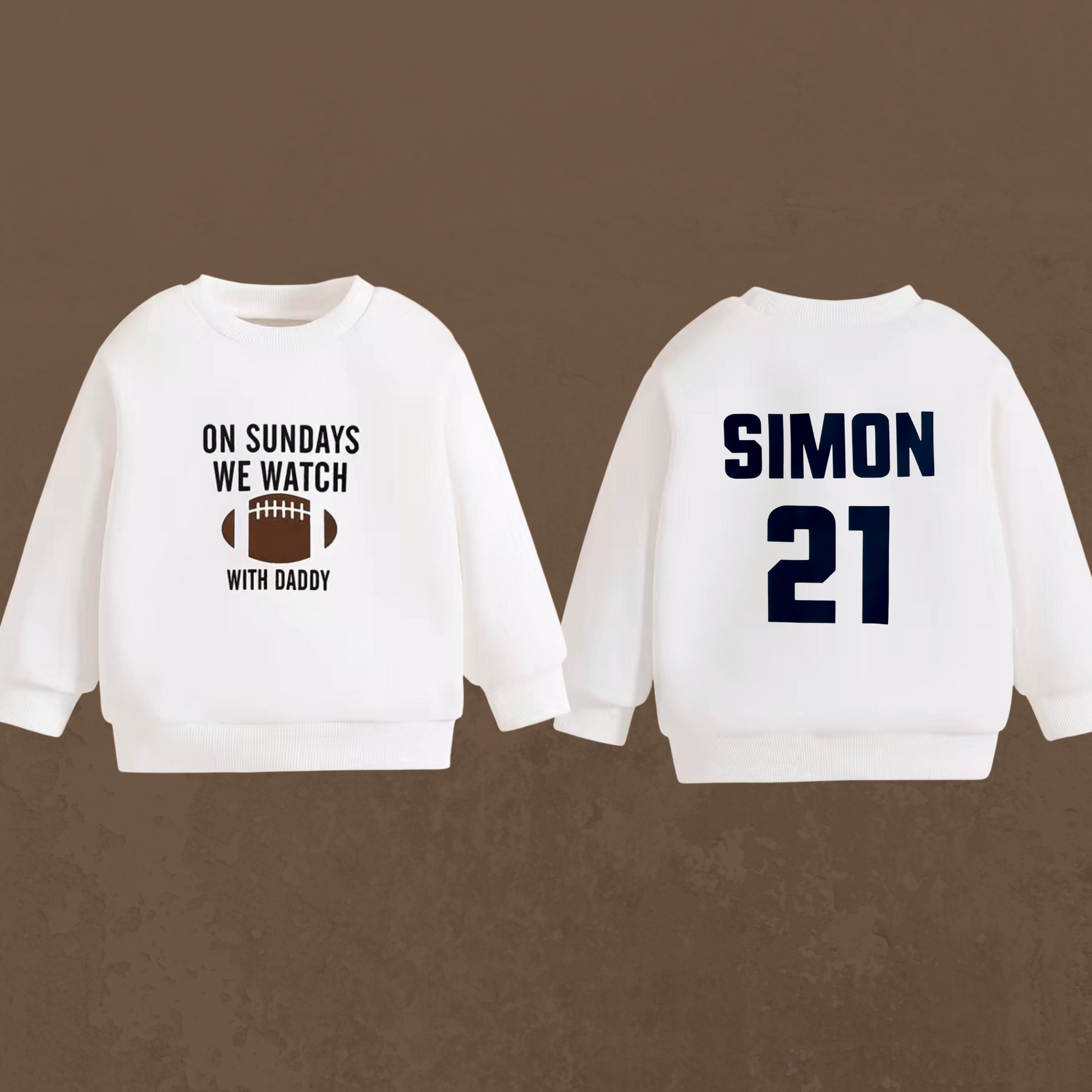 The "On Sundays we Watch Football with Daddy" kids sweatshirt is the perfect piece for your little football fan. Made with comfort in mind, this sweatshirt is crafted from soft and cozy materials that will keep your child warm all day long. The design features a fun football graphic, adding a playful touch to their outfit. Whether they're cheering on their favorite team or tossing around the football in the backyard, this sweatshirt is a must-have for game day. Get ready to huddle up and show off their love for football with this stylish and comfortable kids sweatshirt.