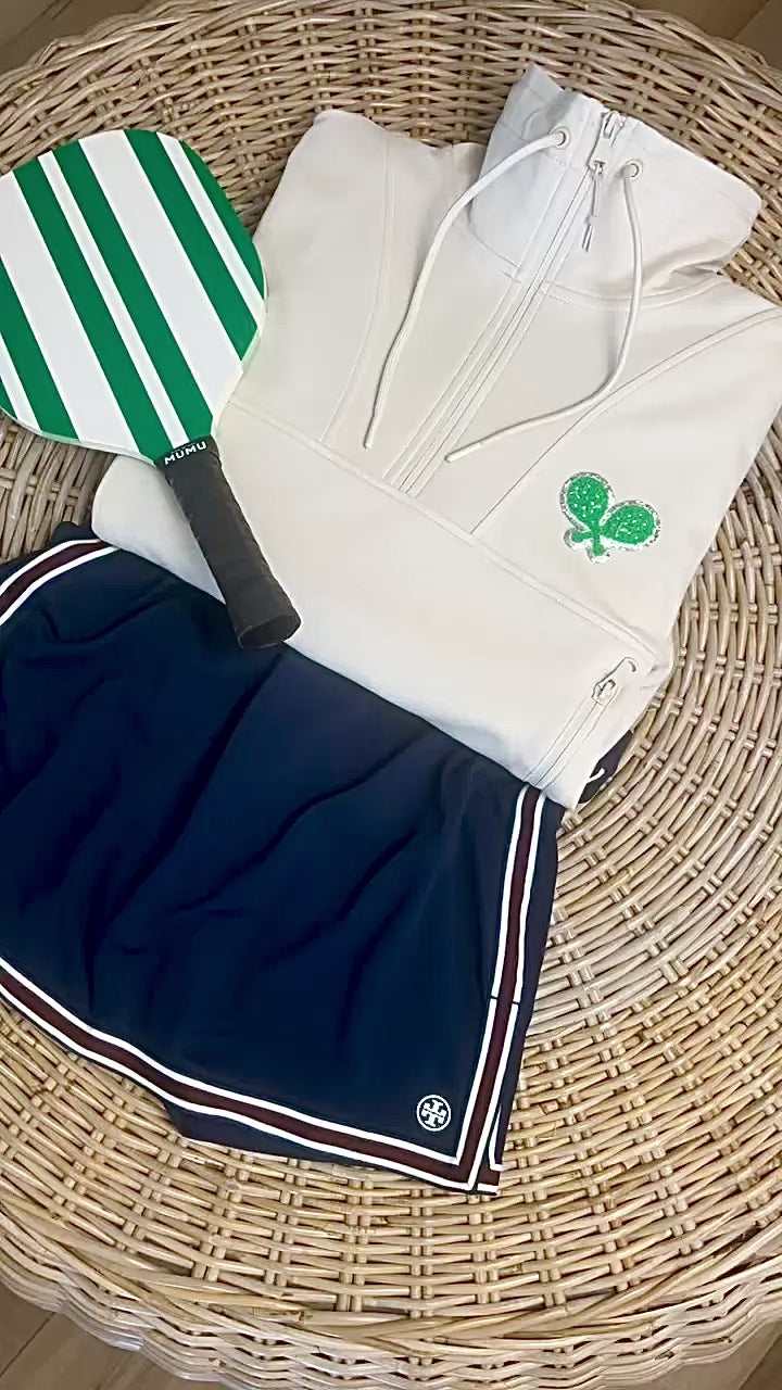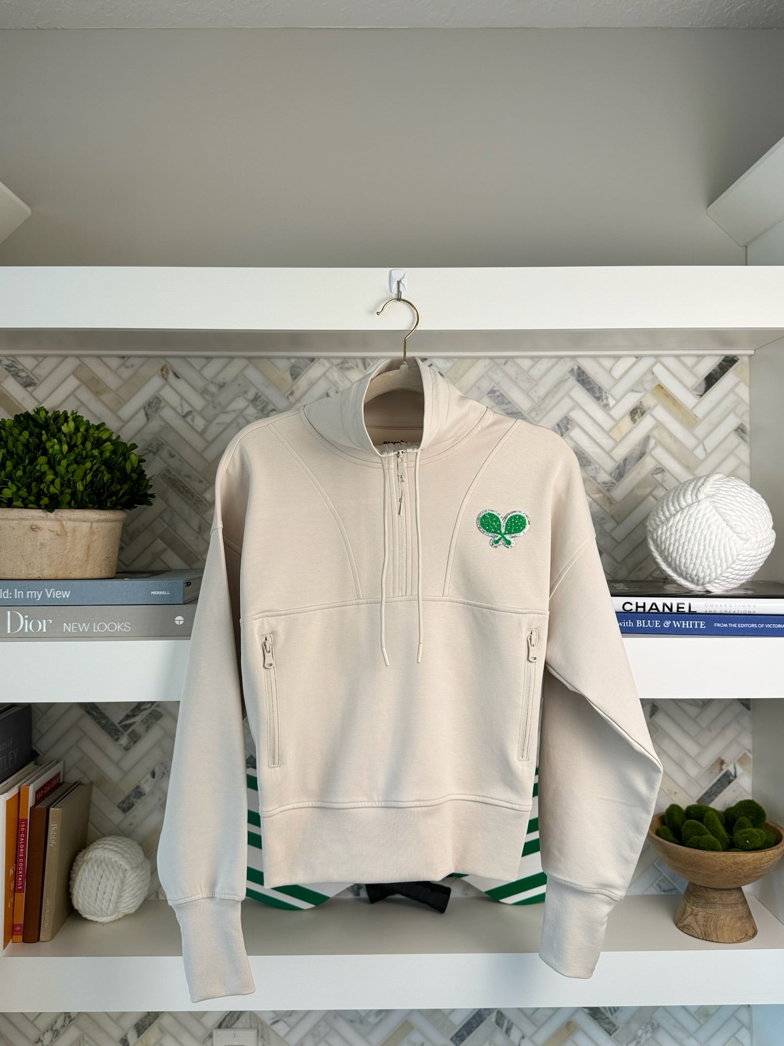Introducing the The RACQUET CLUB Women's Athletic Quarter Zip Jacket, designed for style and performance on the tennis court. Available in three neutral colors, this jacket features a drawstring neck for customizable comfort, a half-zip front for easy on-and-off, and hole cuffs for a modern, sleek look. The chenille patch showcases a set of glitter tennis rackets, adding a touch of tennis-inspired glamour. Personalize your jacket with a customized name and/or country club for a unique touch. Elevate your game with this stylish, trend-setting tennis jacket.